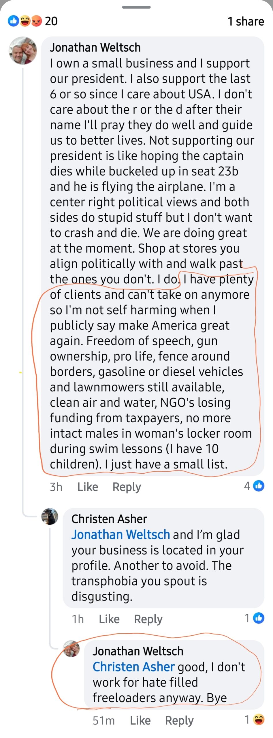 Owner Jonathan Weltsch wants to MAGA. Doesn’t want our business, so don’t give it to him.